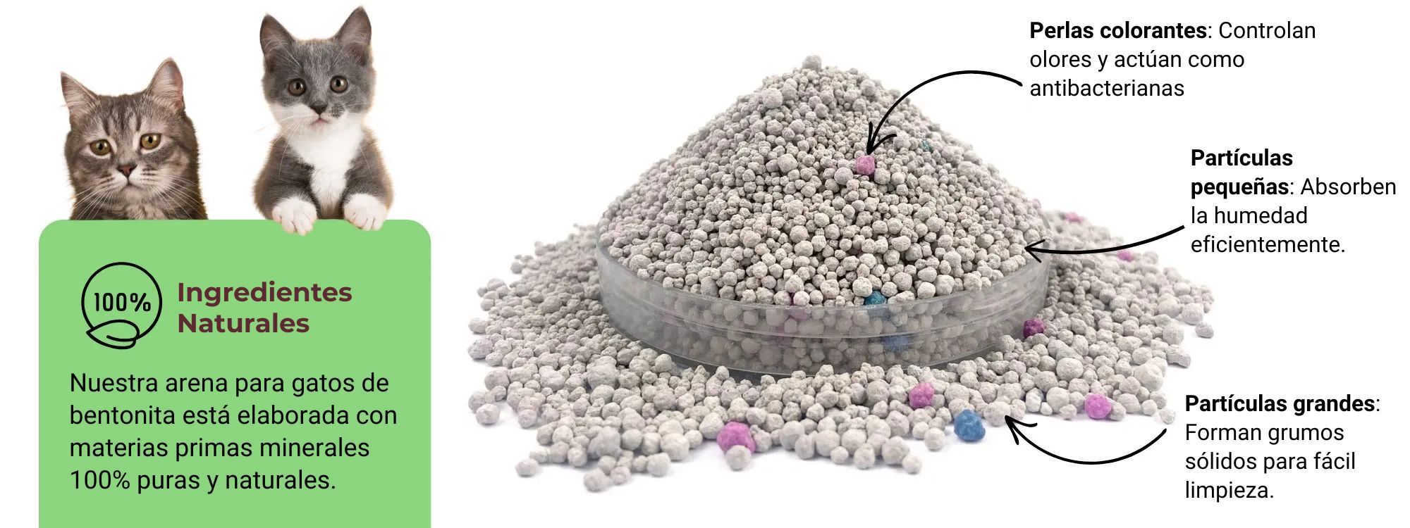 ✅ 99.99% Libre de Polvo: Gracias a un tratamiento especial de gránulos, reducimos la presencia de polvo al mínimo en la arena final de bentonita para gatos, minimizando así el impacto respiratorio en tu gato.