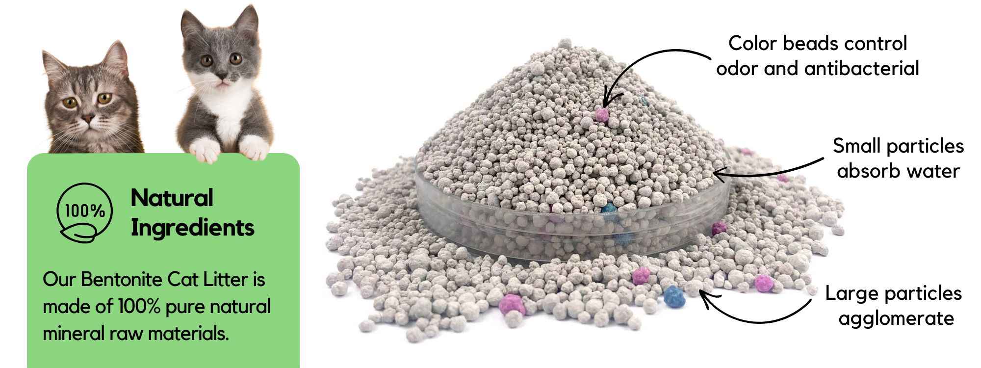 - Moisture absorption: When cat urine comes into contact with Bentonite clay particles, they quickly absorb the moisture.
