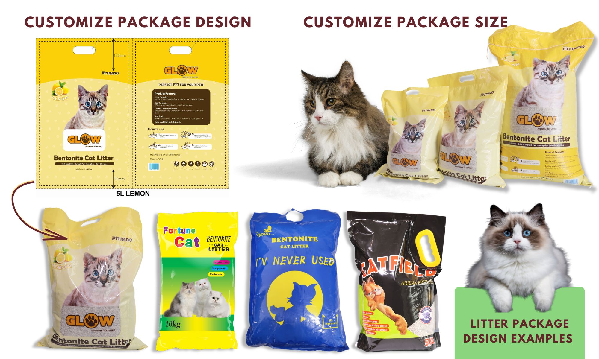 As a professional bentonite cat litter maker, we specialize in creating tailored bentonite cat litter OEM packaging that meets your unique needs. Simply share your designs and logo with us, and we’ll deliver exactly what you envision!