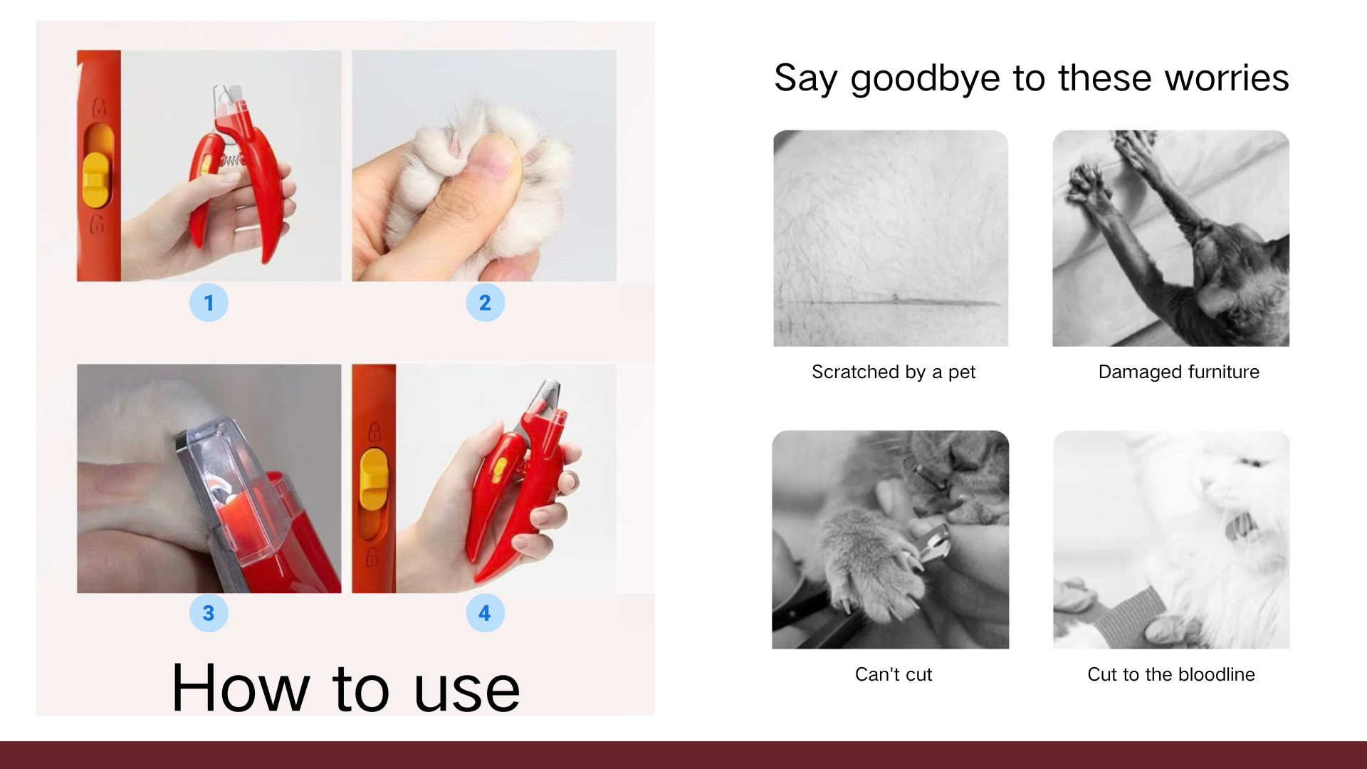 This practical Pet Nail Clipper is universal for dogs and cats, a must-have for pet owners. Its sharp stainless steel blade ensures precise, rust-resistant trimming without hurting your furry friend's paws. The transparent protective shield blocks flying nail clippings, keeping your space tidy. Equipped with a safety lock, it's easy to store and prevents accidental cuts when unused. The ergonomic ABS handle offers a comfortable, non-slip grip, reducing hand fatigue during grooming. This tool turns nail-trimming into a quick, safe, hassle-free task for both you and your pets.